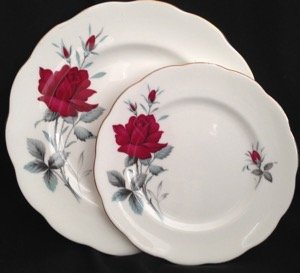 Large red roses decorates the white china. Trimmed in gold on the rims. Produced from 1960 to 1978. Marked Royal Albert Sweet Romance on the underside.