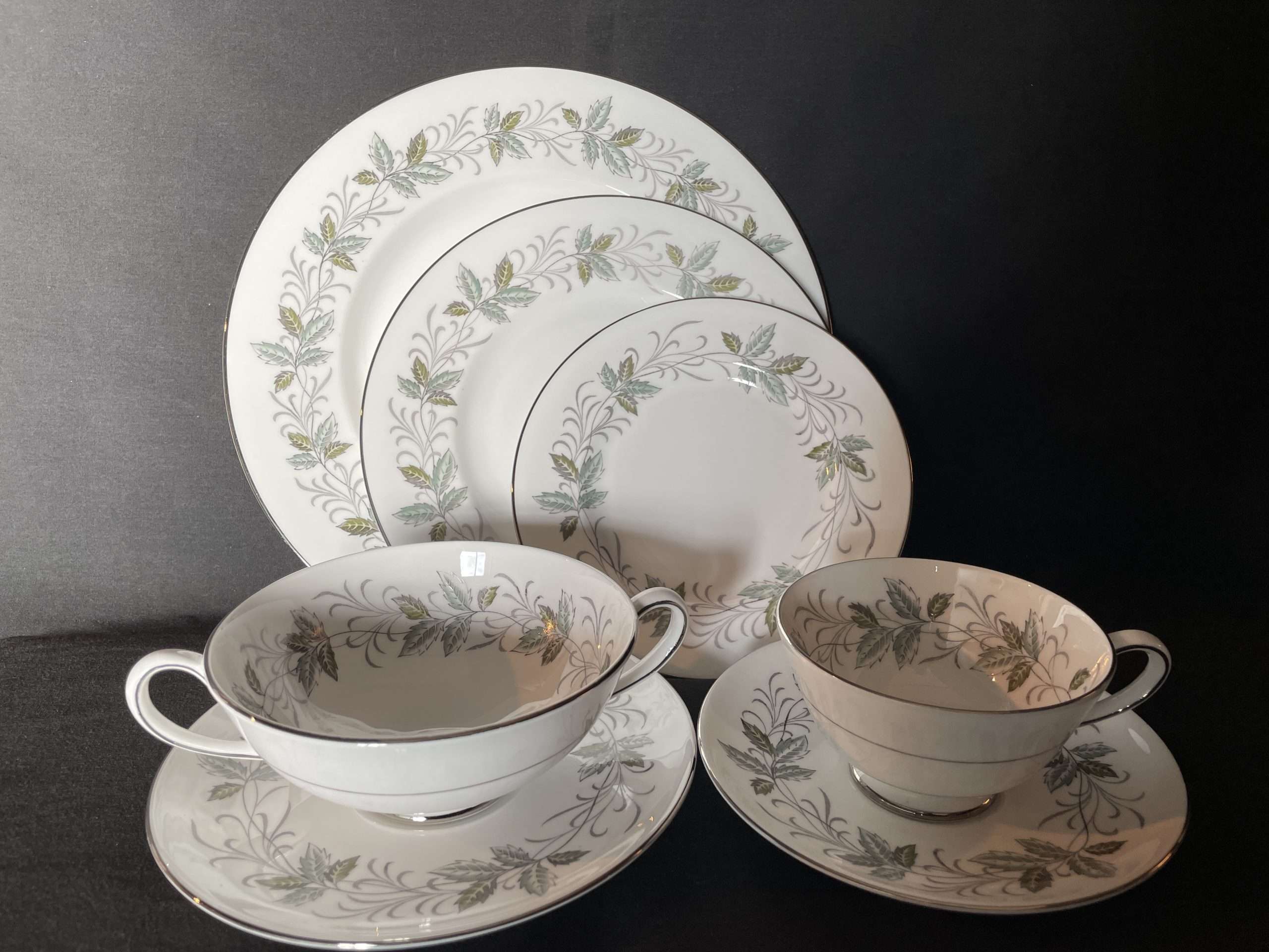 A band of leaves in light green and grey decorates the white china. The flat rims are trimmed in platinum. Marked Tuscan Windermere on the underside. This set includes 6 of the following: